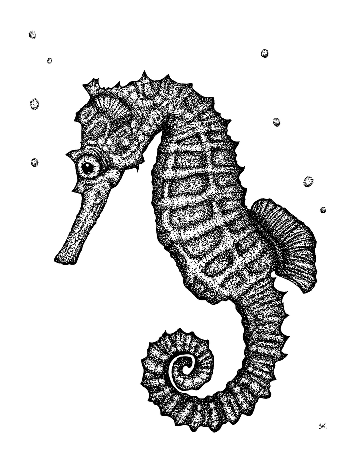 I drew this as a birthday present for a marine scientist friend, Peter. Seahorses mate for life, romance is real in their world, and the male can have babies. Fascinating.